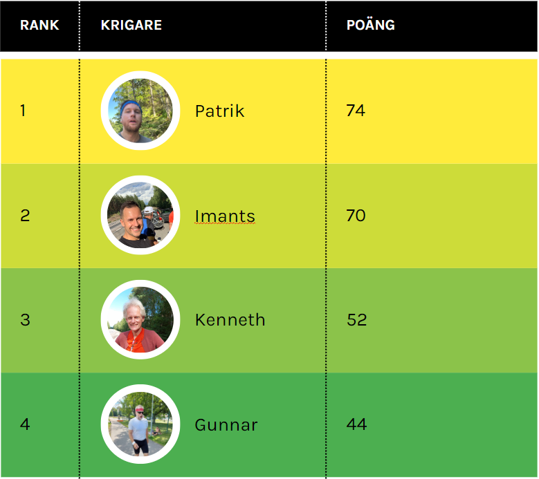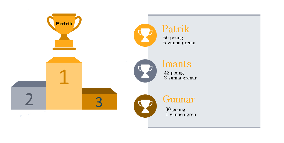 Det mest intressanta från 2023 års resultat är att Imants vann flest grenar (5/10) men att Patrik ändå fick mer total poäng. Slutesultatet kunde knappt ha varit jämnare, Patrik slog Imants med följande små marginaler.